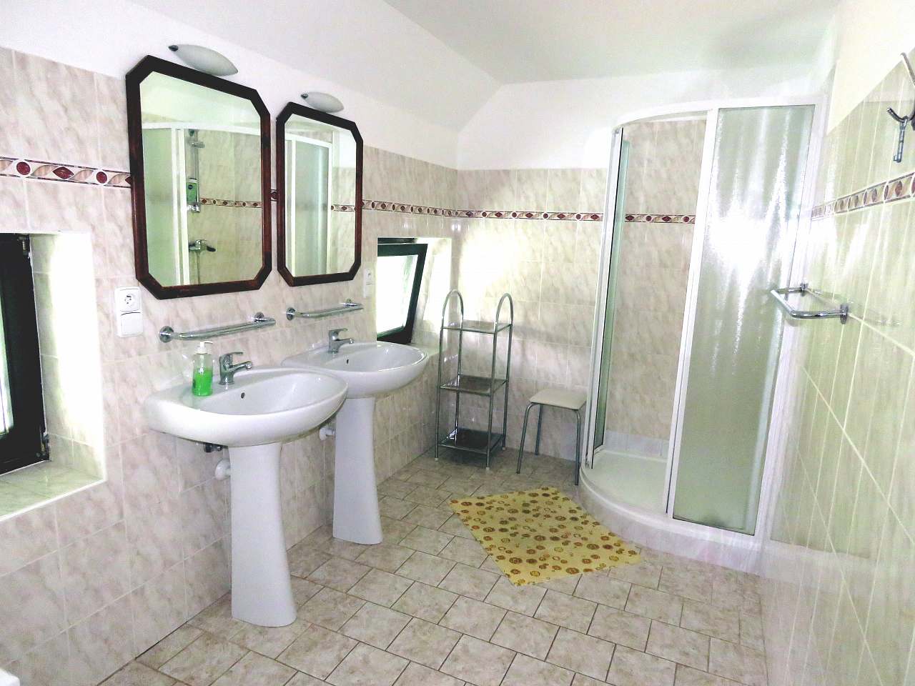 Vlastní koupelna a WC v přízemí na pokoji č.: 3 (bezbarierovým) - pro tři hosty, na ostatních dvou (bezbarierových) pokojích.: 1.a 2.oba pro dva hosti společná sprcha s WC. V podkroví jsou dvě umyvárny ze sprchovým koutem a dvěma samostatnými WC. K dispozici též v podzemním podlaží Infrasauna (na mincovník 25.min. =40Kč) s odpočívárnou a vlastní sprchou a umyvadlem.