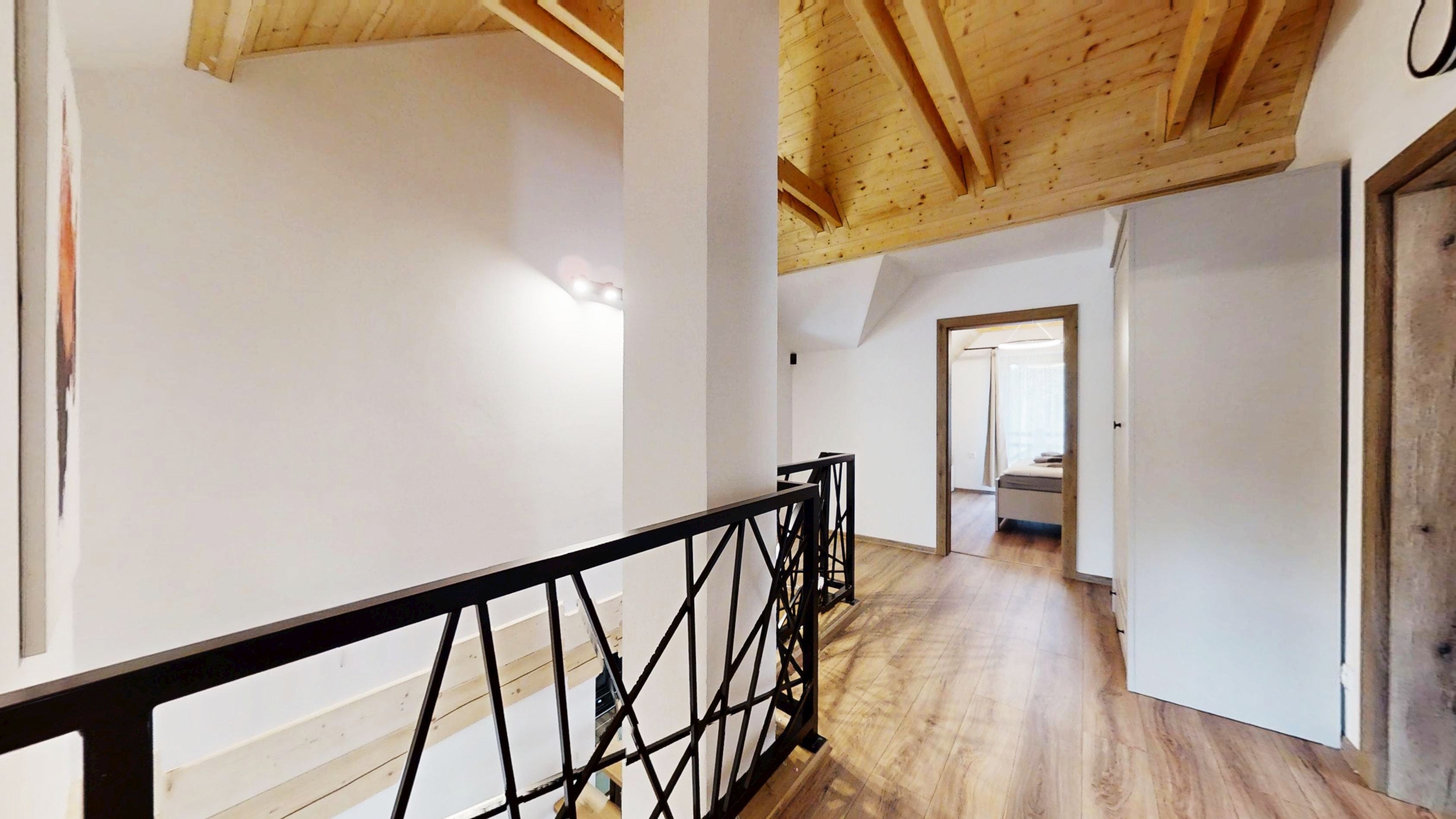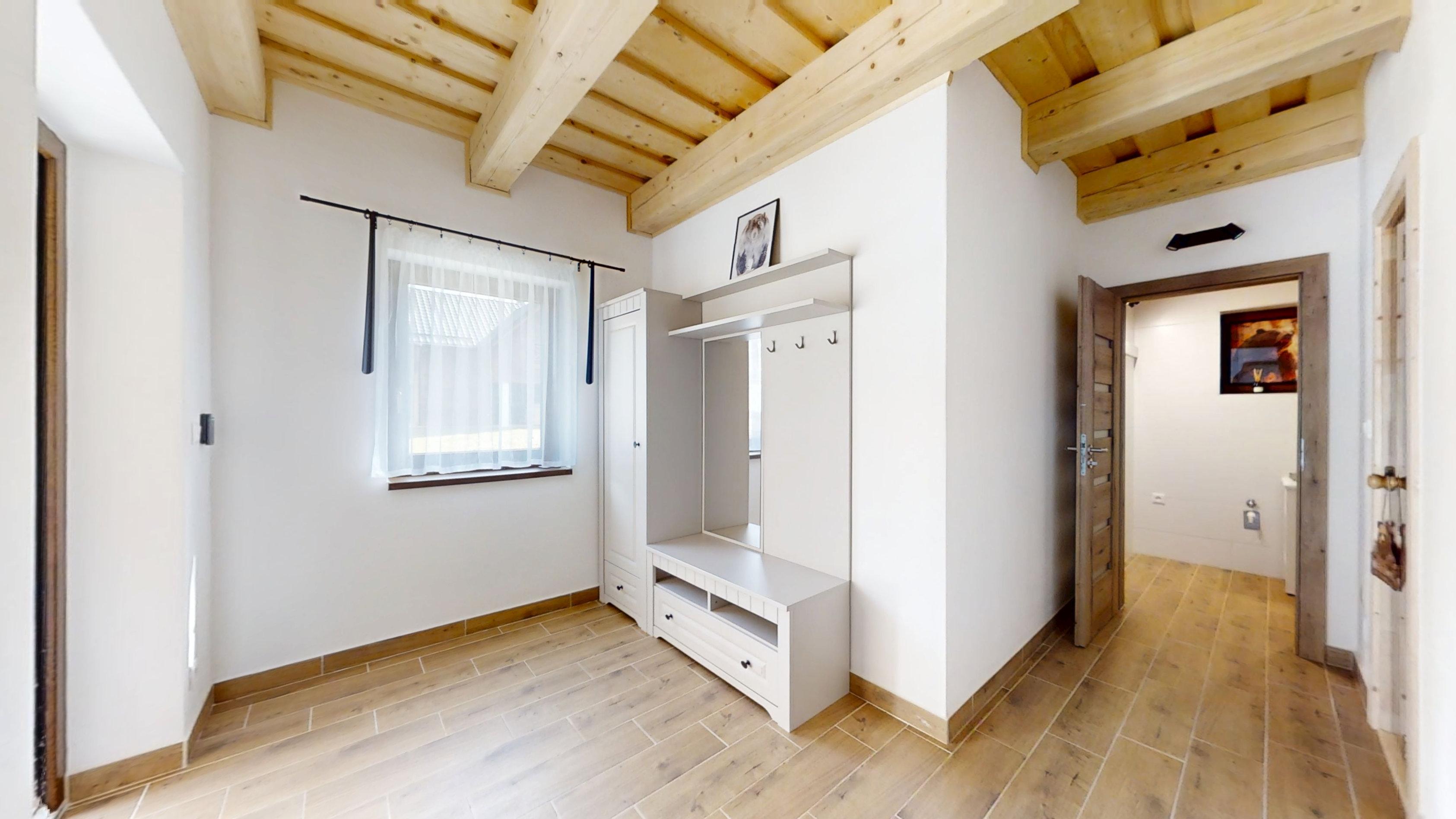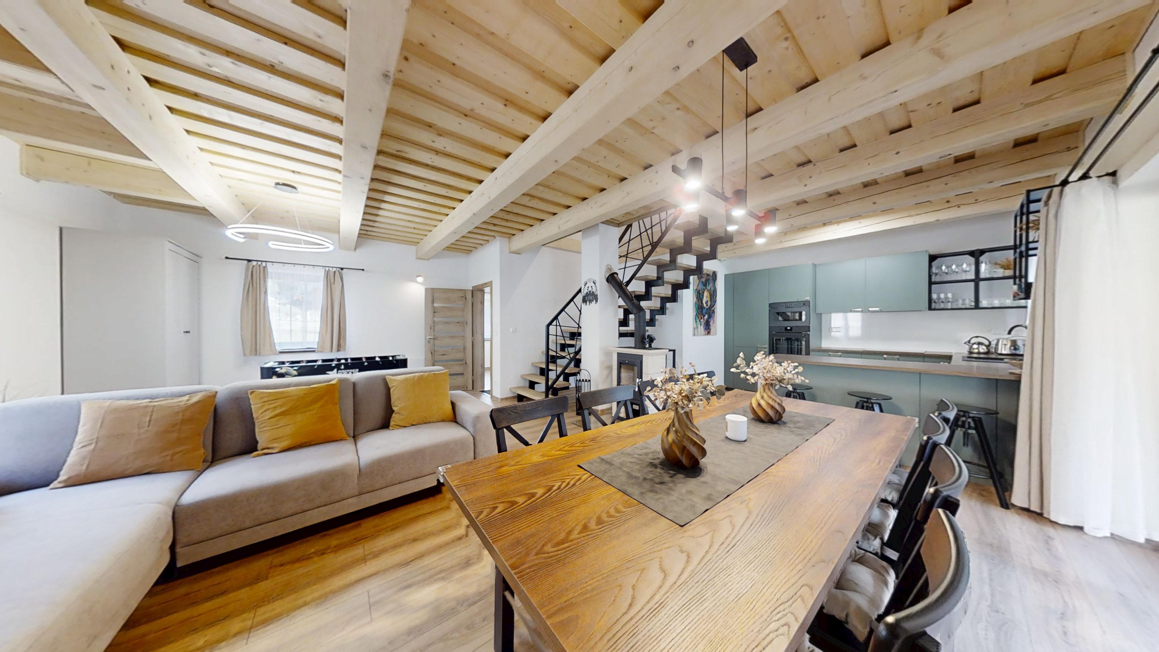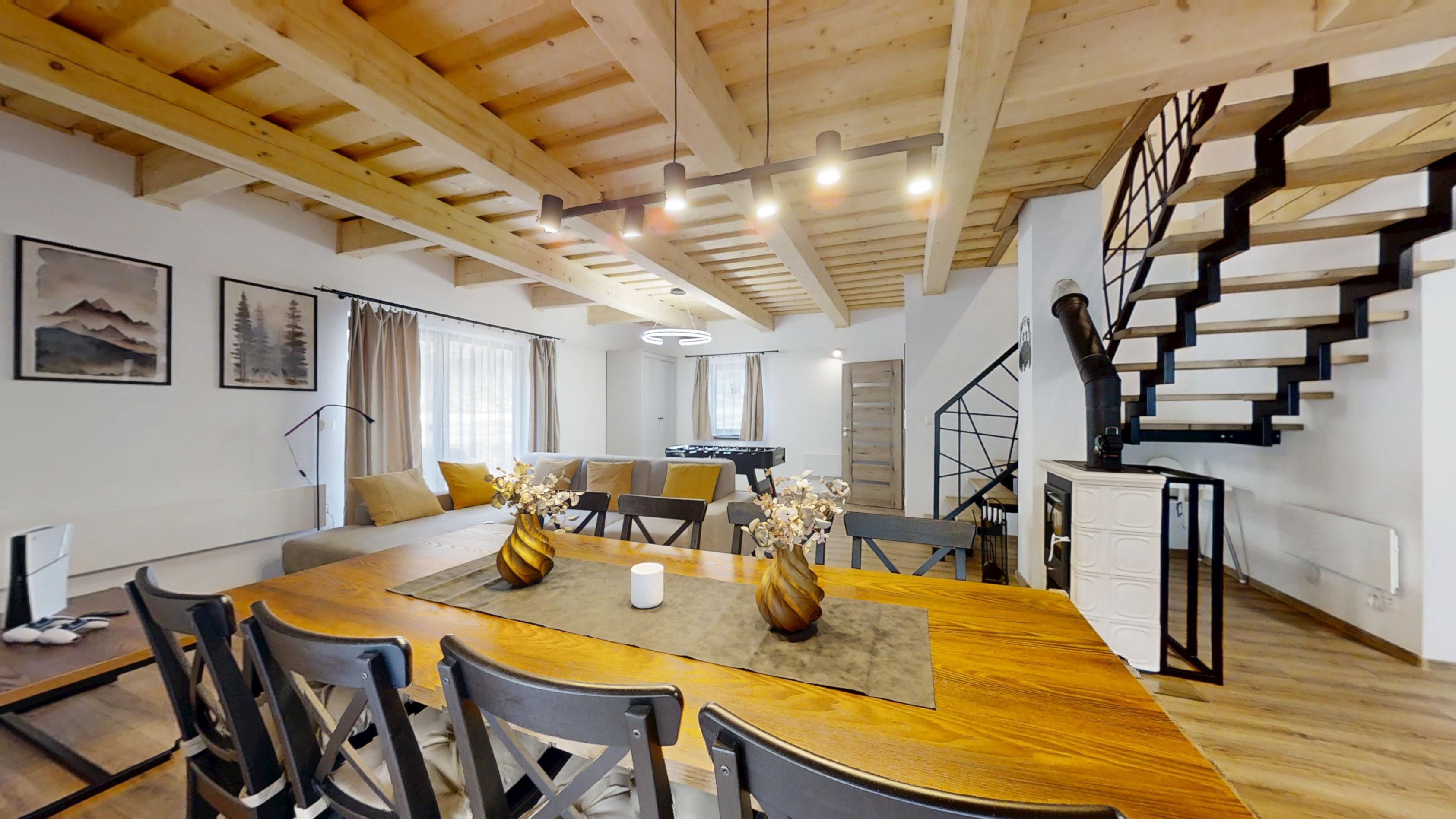 Interiér chaletu je ladený v duchu minimalistickej škandinávskej estetiky, s dôrazom na prírodné materiály a teplo domova.Priestranná obývacia miestnosť s krbom