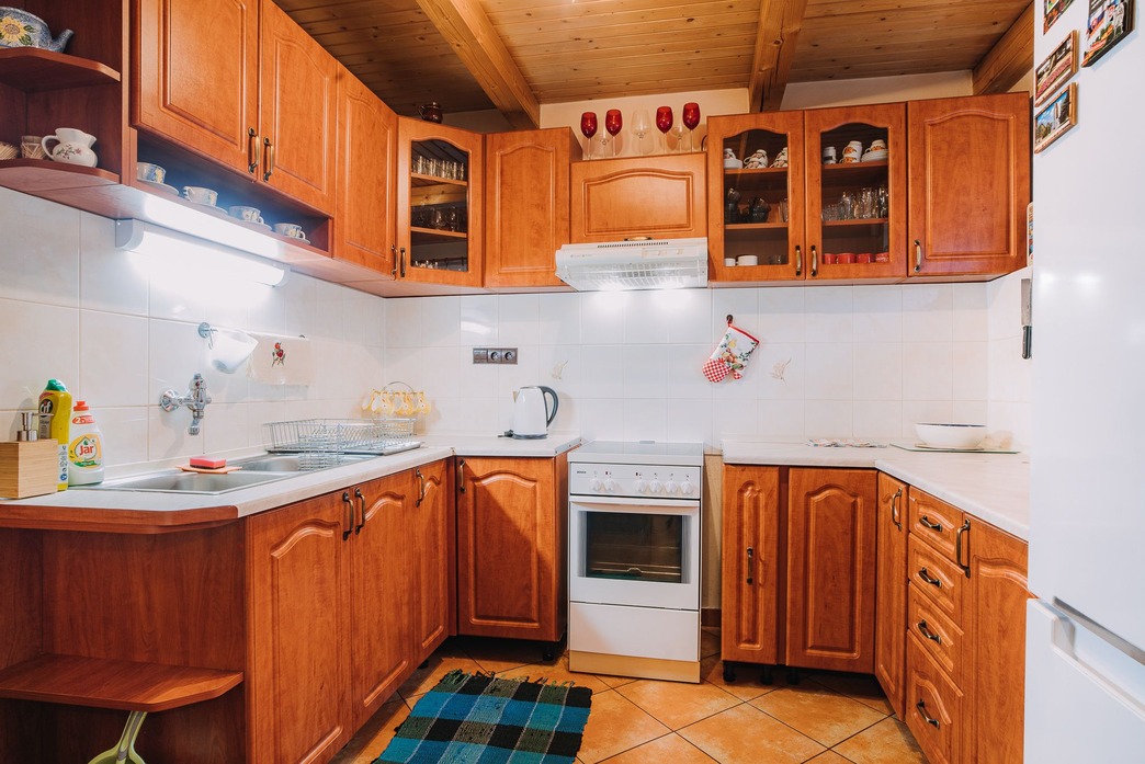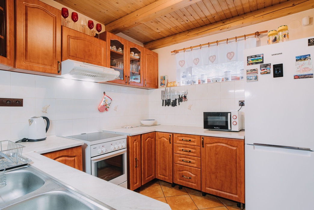 Obývacia časť je prepojená s plne vybavenou kuchyňou, ktorá poteší najmä rodiny s deťmi aj väčšie skupiny.