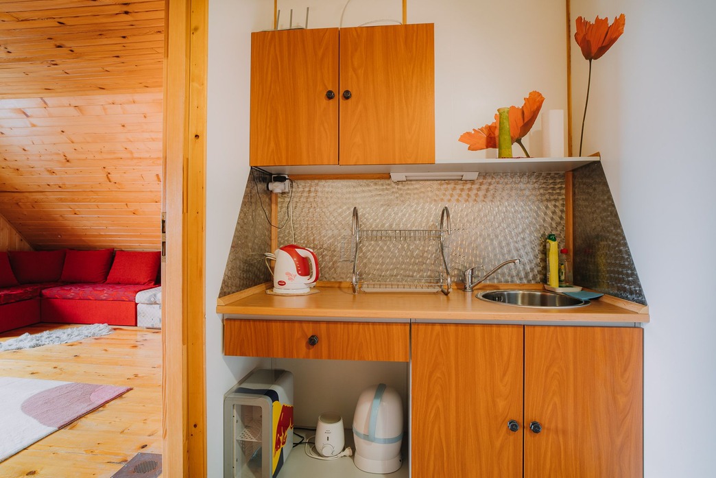 Na poschodí je k dispozícii aj praktický kuchynský kútik (mikrovlnka, rýchlovarná kanvica, mini chladnička, výbava pre deti).