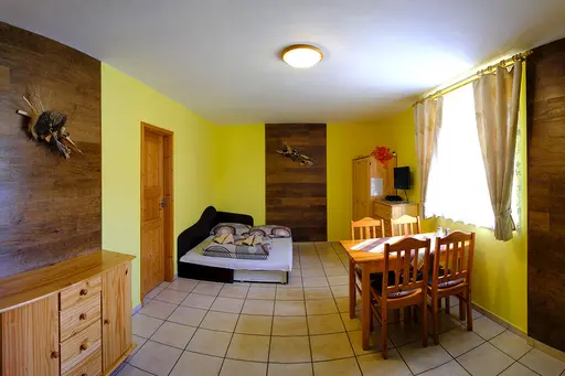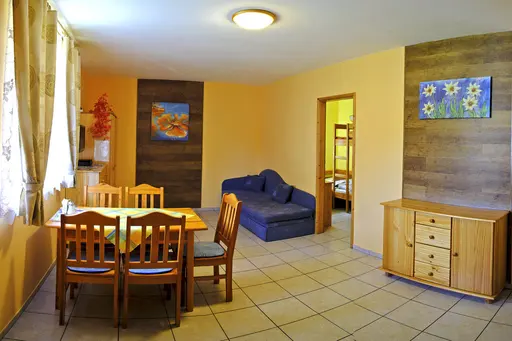 Hlavnou obytnou miestnosťou s rozkladacím gaučom (dvojlôžkom)