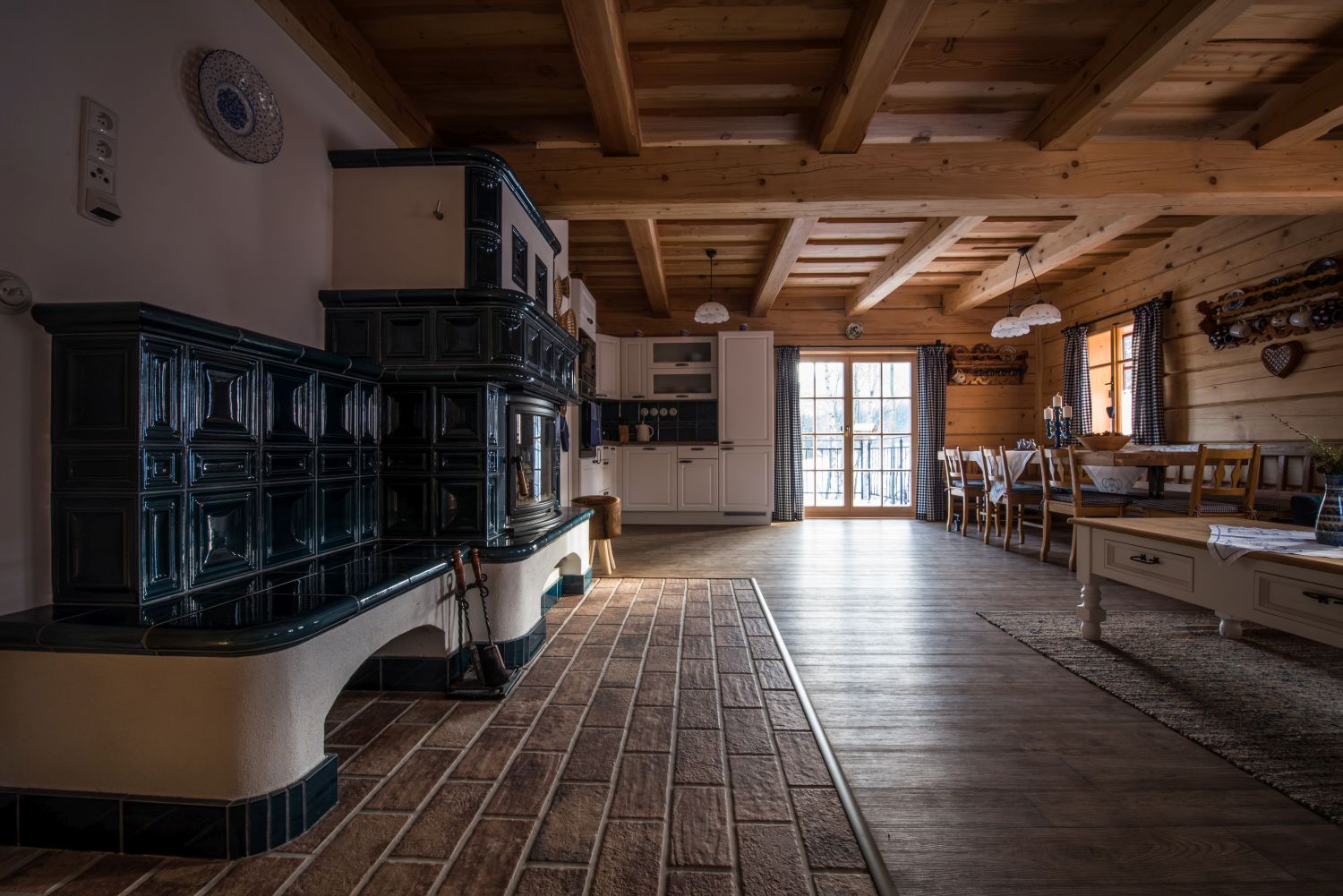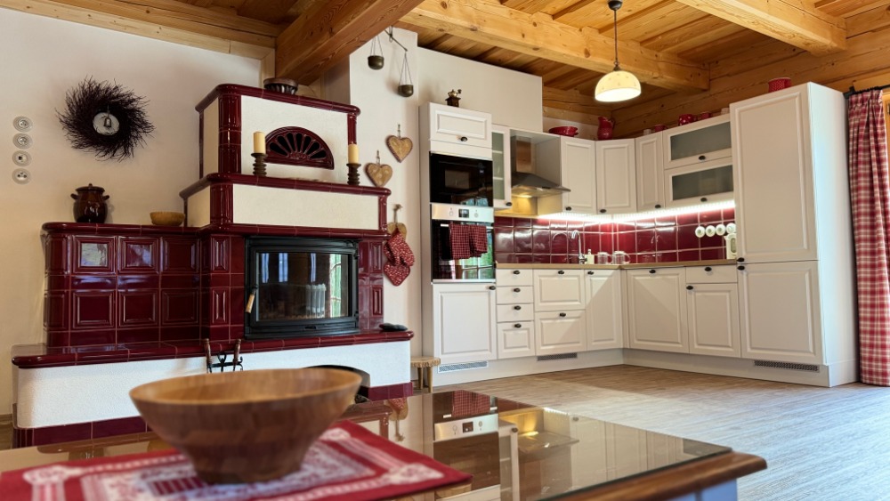 Velkorysý obývací pokoj s kuchyňským koutem je navržen pro větší skupiny. Dominantou jsou krásná kachlová kamna a velký jídelní stůl.